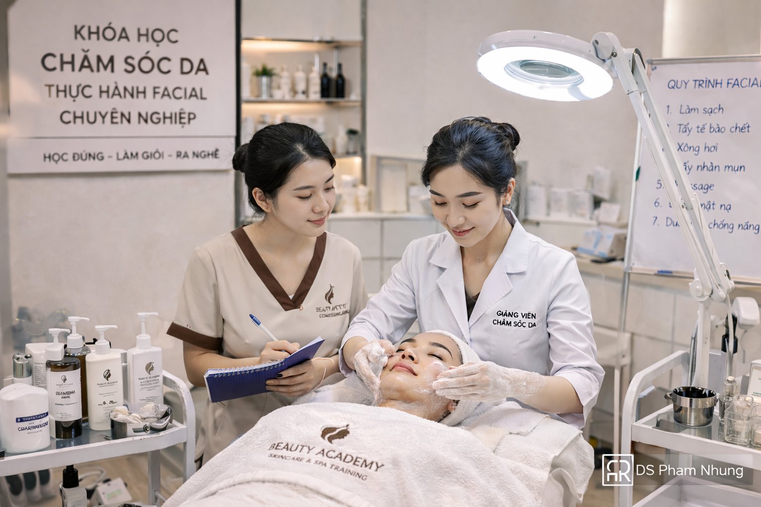 Ngoài ra, học viên còn được học về tư vấn khách hàng, xây dựng phác đồ điều trị và kỹ năng bán hàng. Đây là lựa chọn phù hợp cho những người muốn mở spa hoặc làm việc ở phân khúc cao cấp.