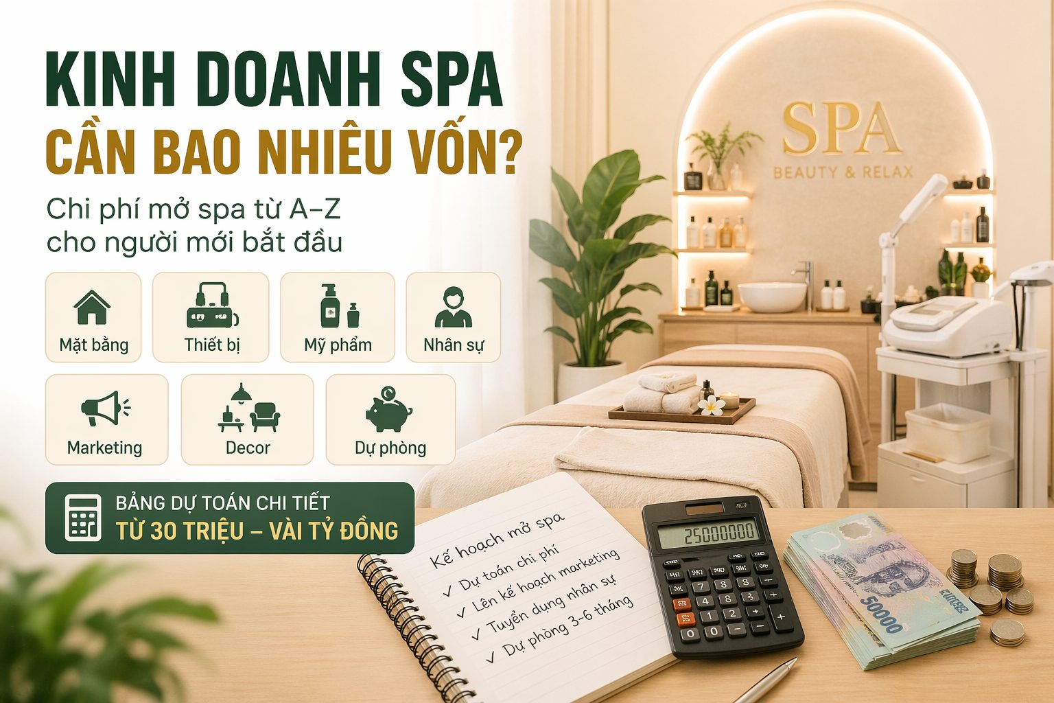 “Kinh doanh spa cần bao nhiêu vốn?” là câu hỏi đầu tiên của hầu hết những người muốn bước vào lĩnh vực làm đẹp. Tuy nhiên, không có một con số cố định cho tất cả mô hình spa. Số vốn mở spa sẽ phụ thuộc vào quy mô, vị trí, phân khúc khách hàng, loại dịch vụ và định hướng thương hiệu.